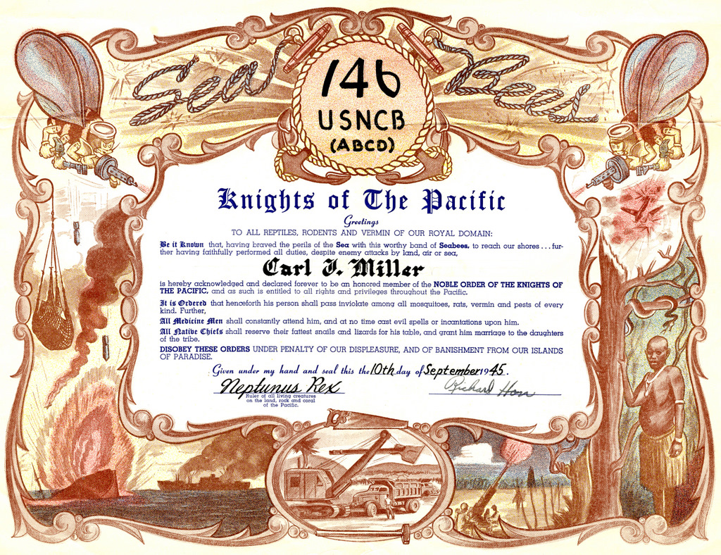 These photos came from a member of the 146th Seabees Fire Department, part of the Headquarters Company. They arrived on Okinawa in late July 1945 aboard the S.S. Sea Devil as you can see from the date on his Domain of the Golden Dragon - crossing of the International Date Line certificate. After the end of the war on 2 Sept. 1945 he received a Seabees Knights of the Pacific certificate dated 10 Sept 1945. I have almost no information on what the 146th NCB did while on Okinawa although I am sure they were involved in many of the constructions projects on Okinawa at the time.