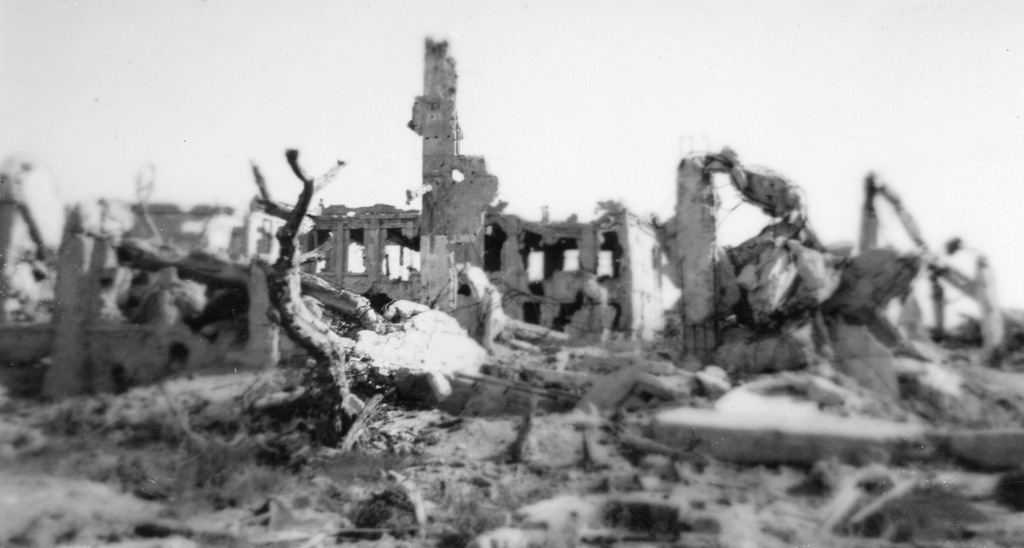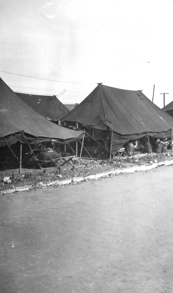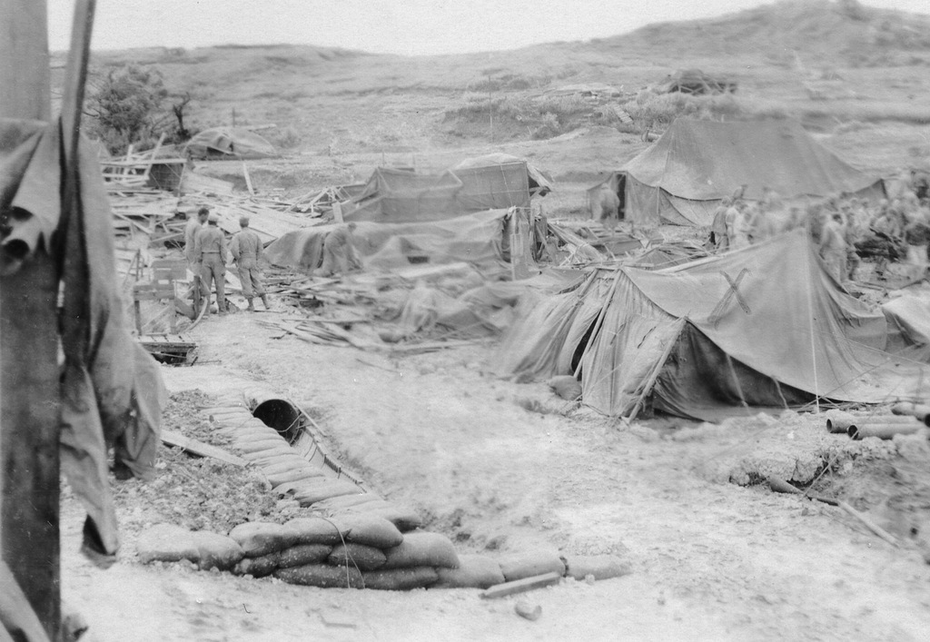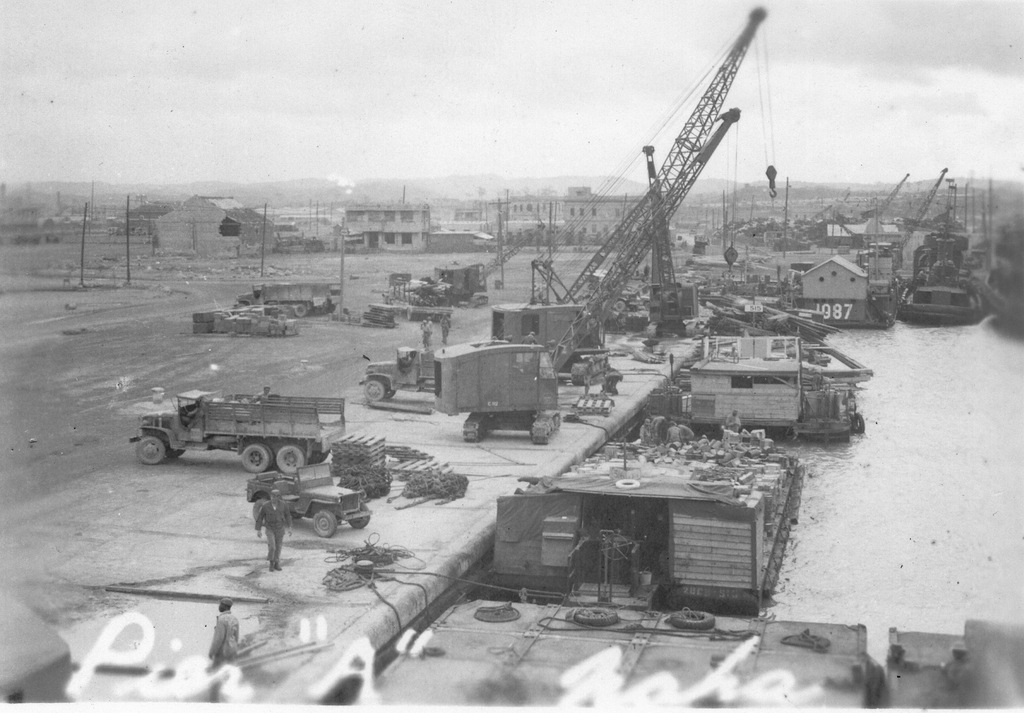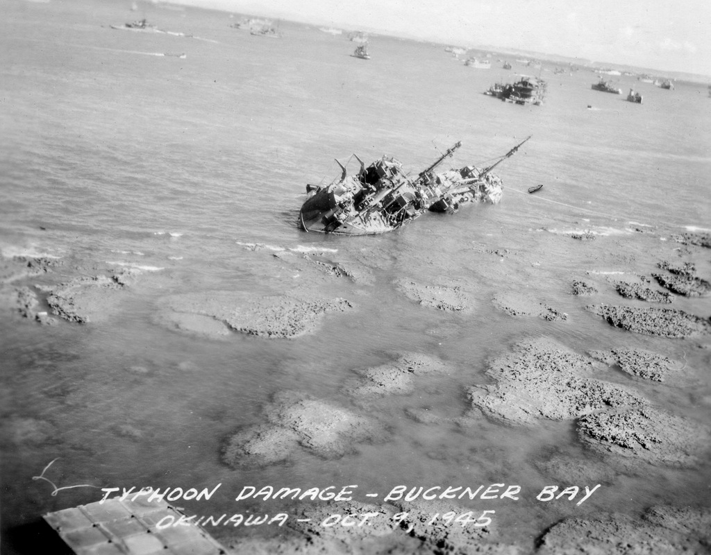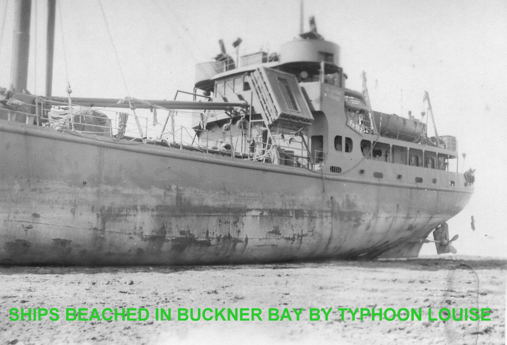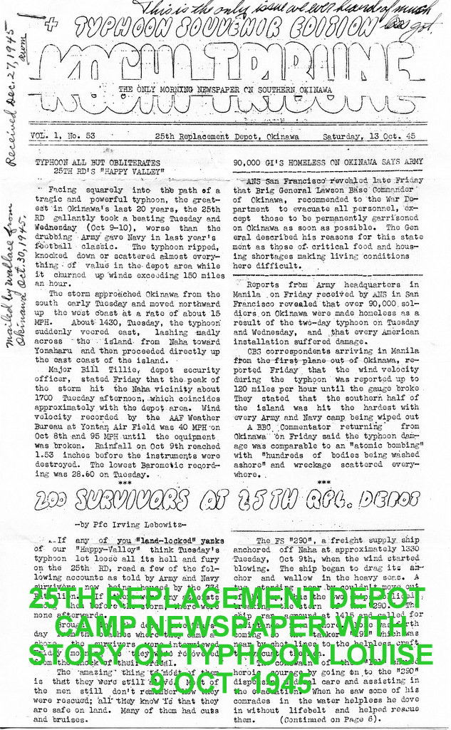 More photos of camp life from the album of Cpl. Robert Hetrick. On 9 October 1945 super typhoon Louise hit Okinawa and destroyed 90% of the military structures on Okinawa and beached and sunk a large number of ships. His photos show the damage to the camp and ships at Buckner Bay. Additional photos he bought on Okinawa showing other military scenes. On 14 June 1946 Cpl. Hetrick left Okinawa on board the USS Sea Cat bound for the United States and his discharge from the Army.