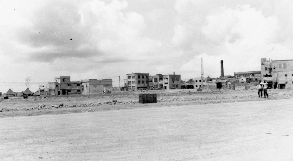 Views of the main camp which was at or near Kadena Air Field. Quonset huts and other buildings and tents around the camp, some of their equipment and pictures of some of the fuel storage tanks and pipelines that they installed.