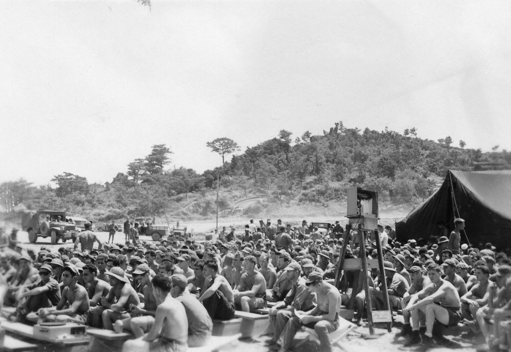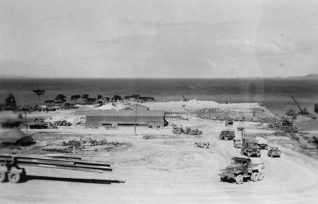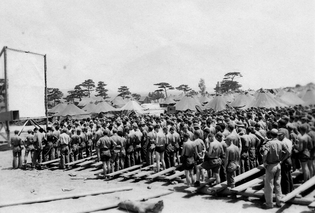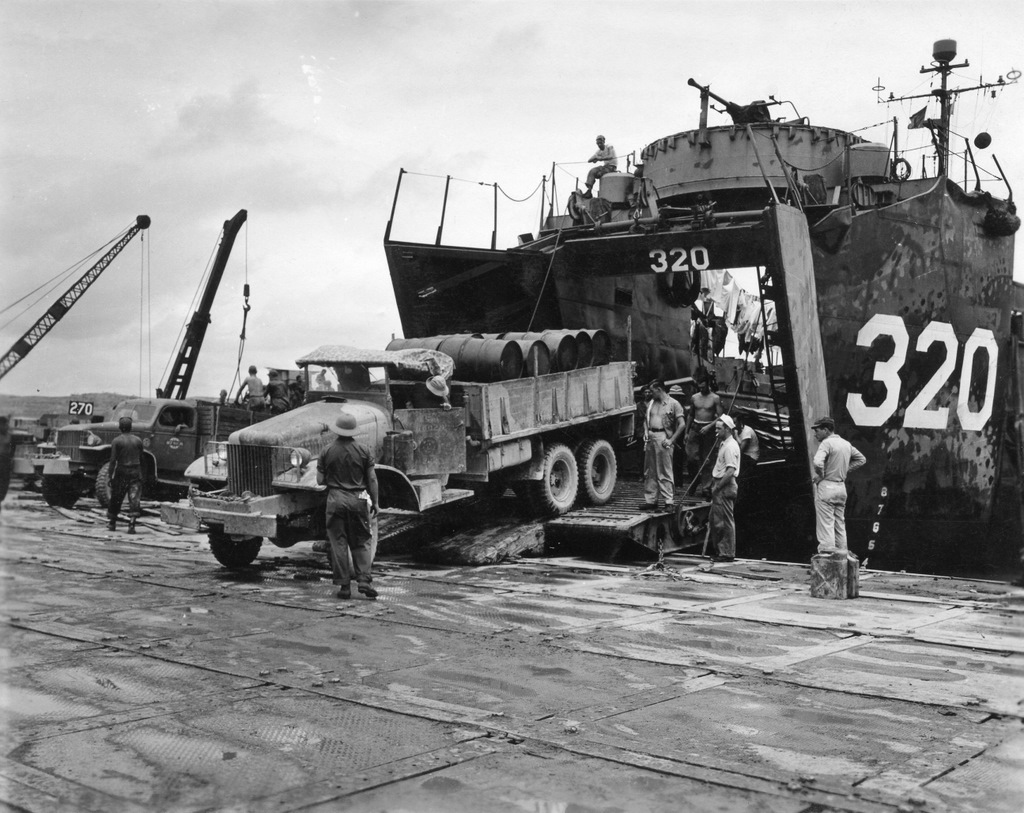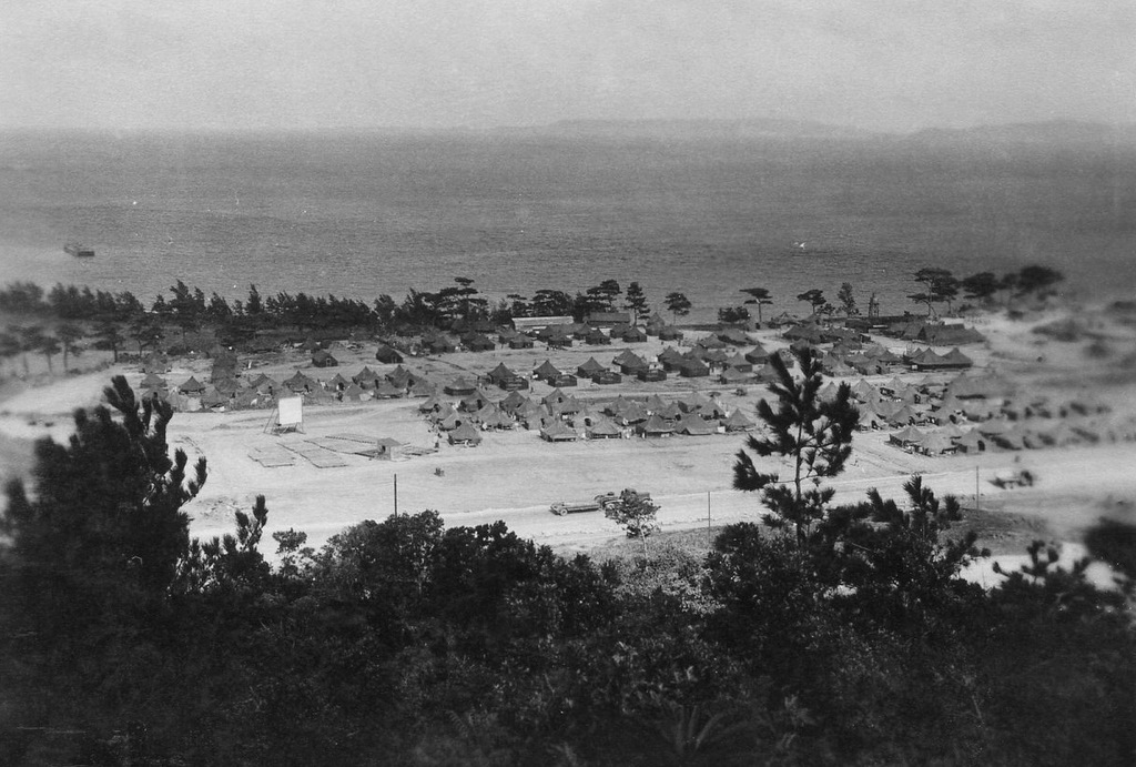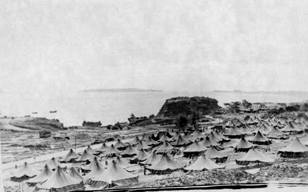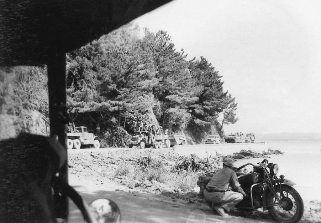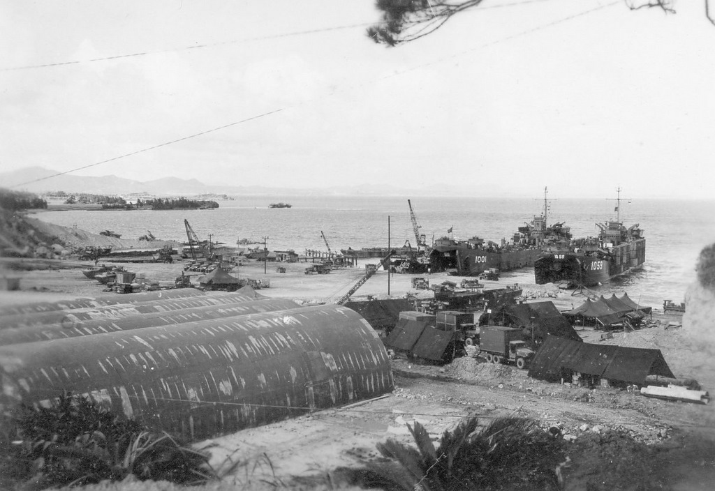 Scenes showing some of the military cemeteries on Okinawa, GI movie theaters, and unloading LST's