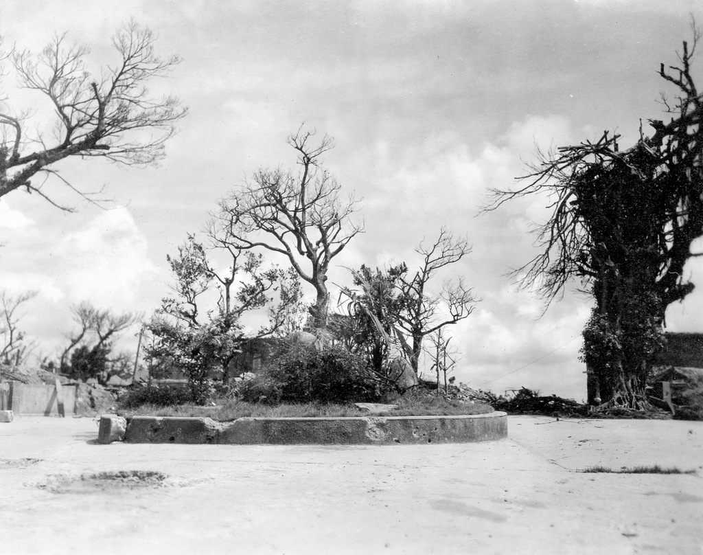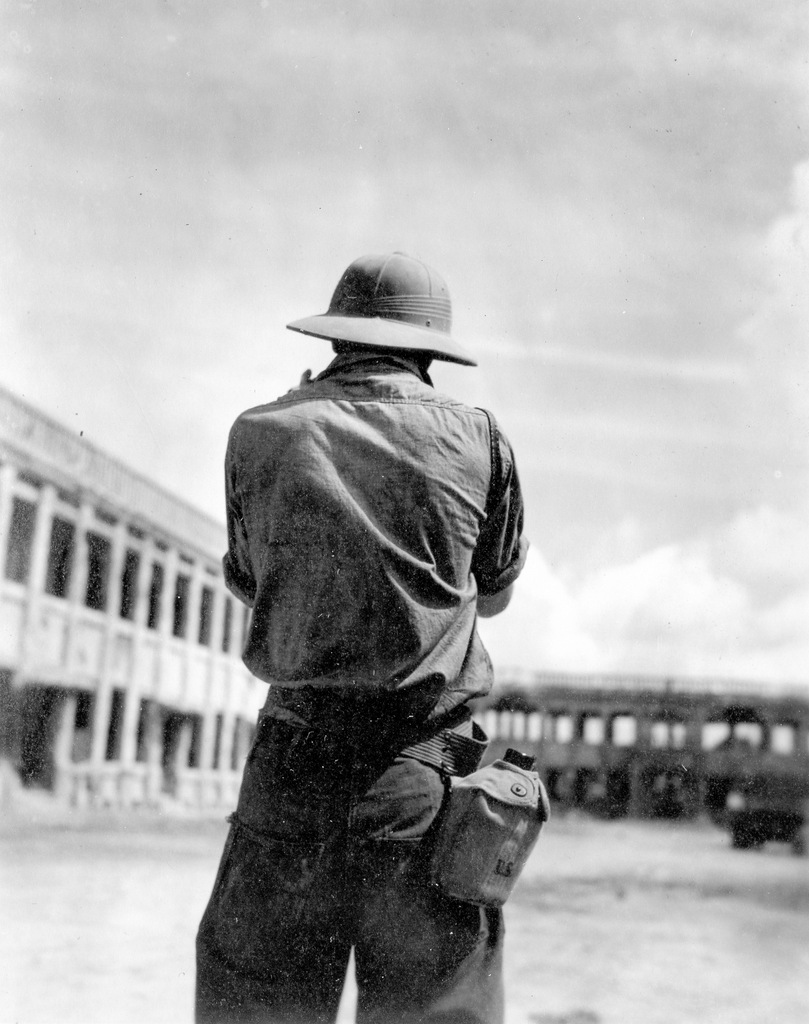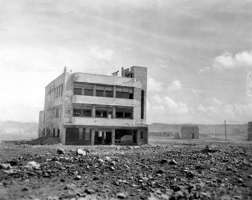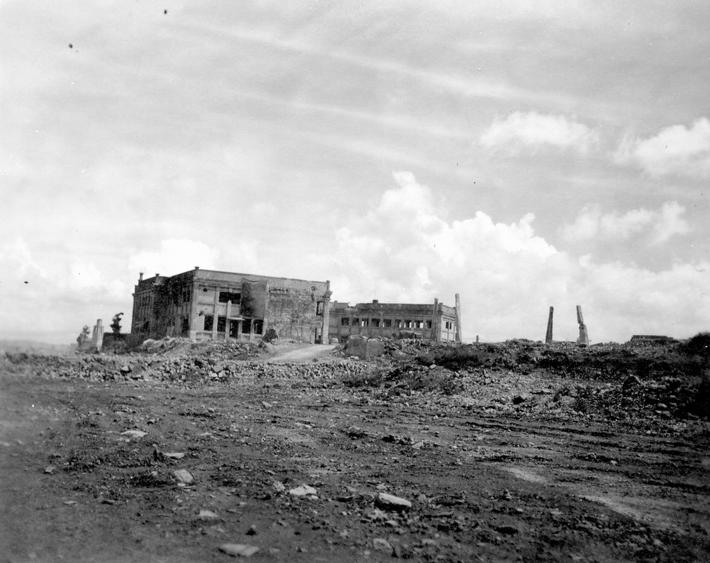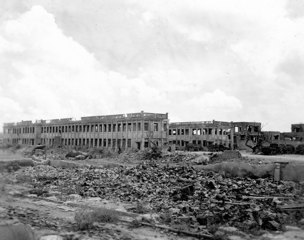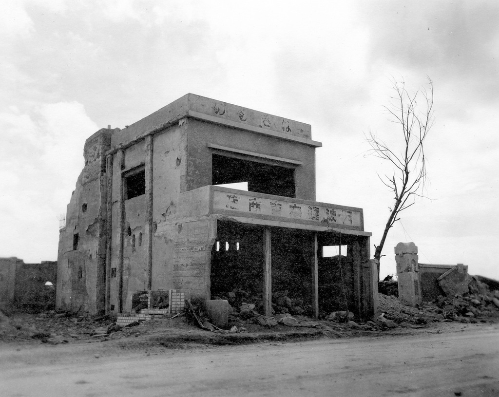 Three GIs take a tour of the war damage at Naha in August 1945. Bryce E. Starling, the photographer, and his friends Frank Farrell and Harrold Barclay.