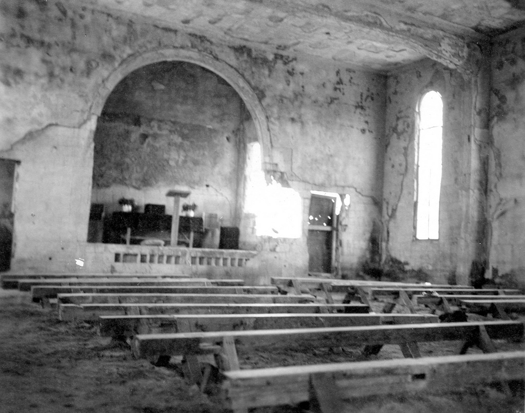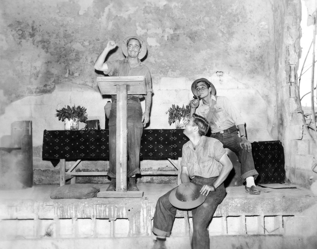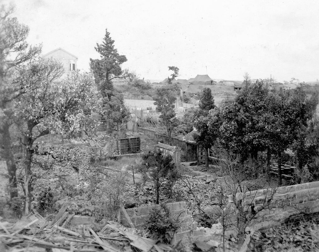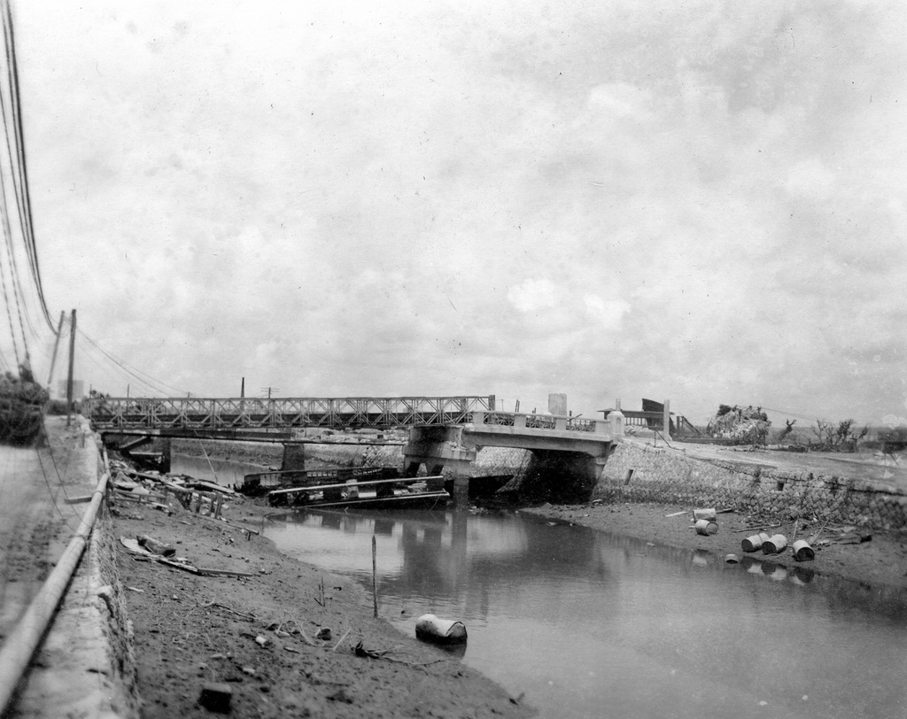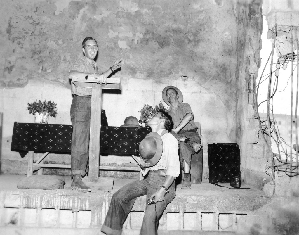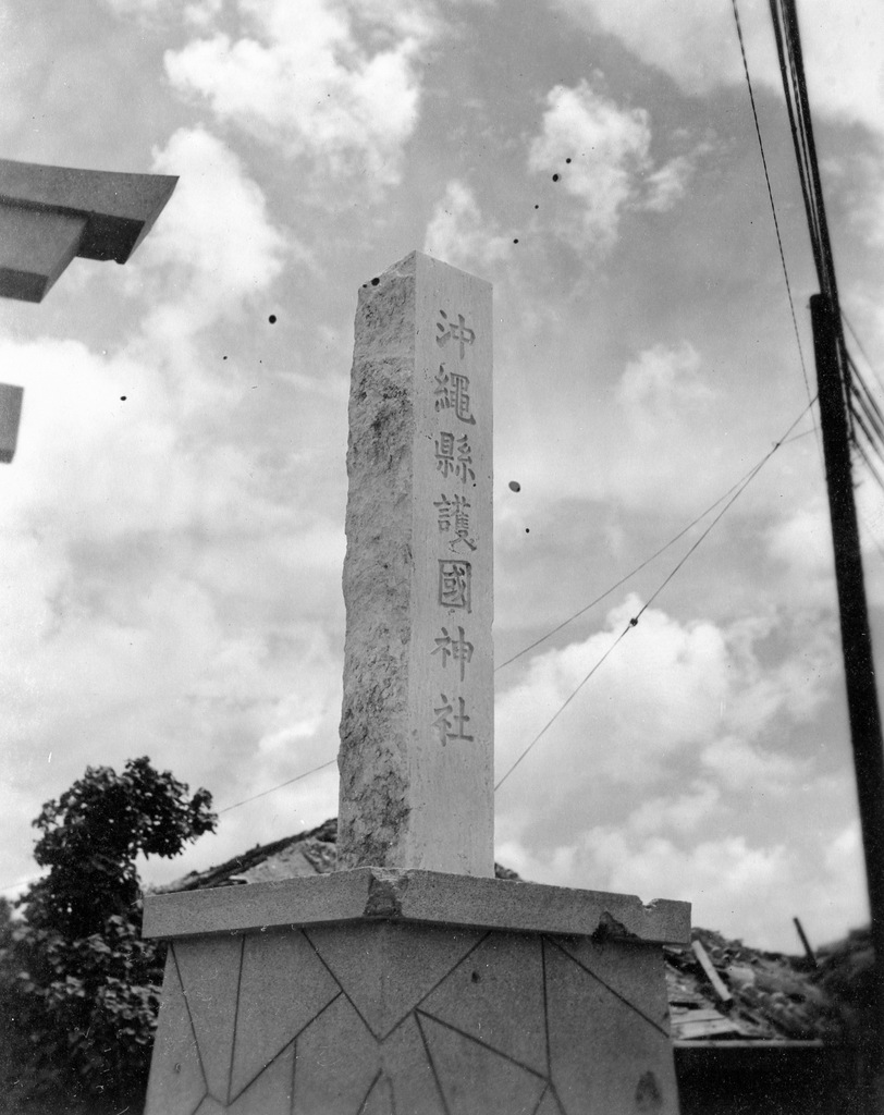 Three GIs take a tour of the war damage at Naha in August 1945. Bryce E. Starling, the photographer, and his friends Frank Farrell and Harrold Barclay.