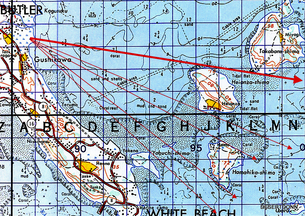 If you look at the map (Top Left - 1959 US Topographic) you will see where I believe the GI was standing when he took a series of snap shots of his camp (top right) on the coast of Okinawa. On the horizon you can see the islands of Miyagi (Takabanare), Heianza (Henza) and Hamahika (Hama-Higa).