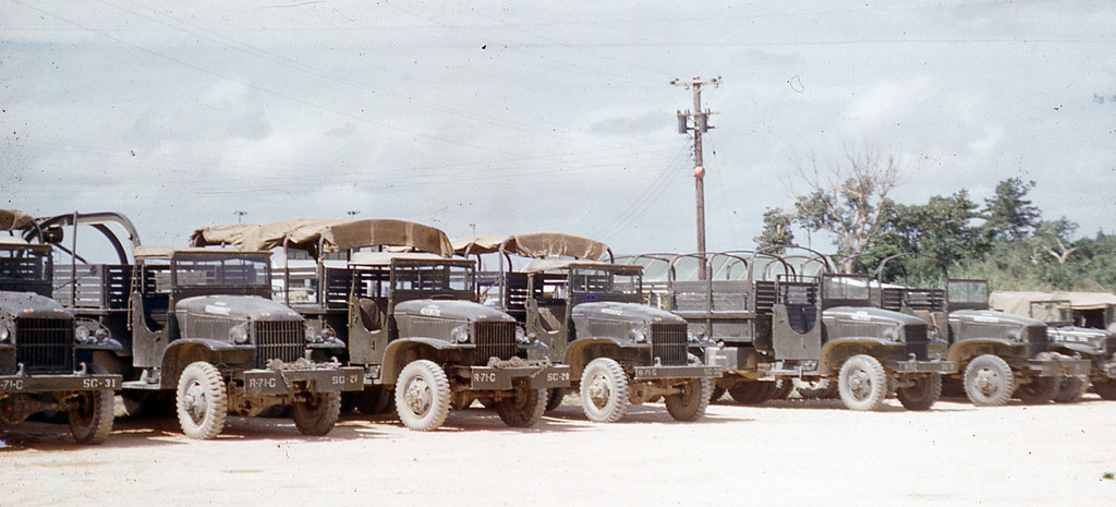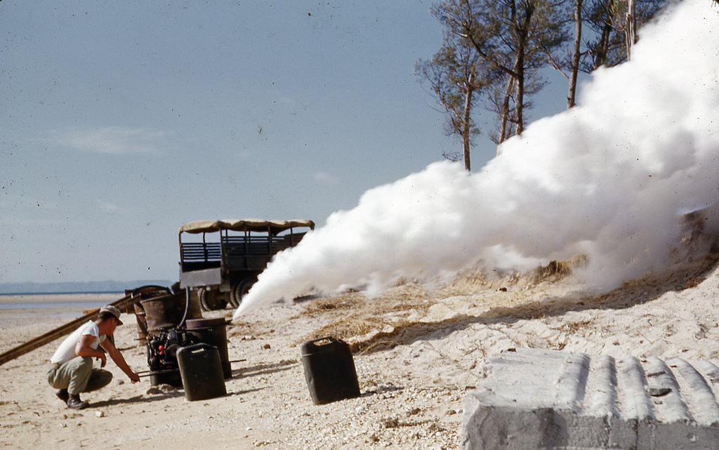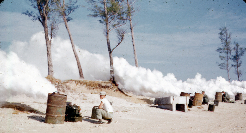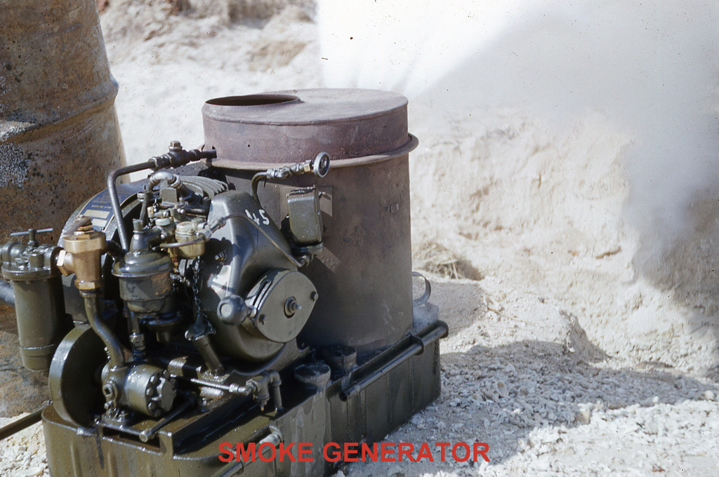 Unknown Army military unit that was trained at Camp Stoneman in California. The unit was stationed in the Camp Kue - Camp Sukiran area. Interesting photos of a smoke generation exercise.