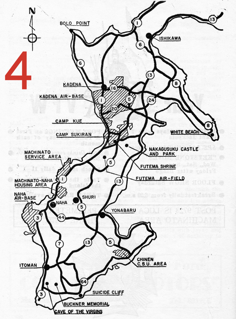 - Map #4 Southern Okinawa, Itoman, Chinen, Yonabaru, Naha, Machinato, Shuri, Futema, Nakagusuku, White Beach, Camp Sukiran, Camp Kue, Kadena, Bolo Point, Ishikawa